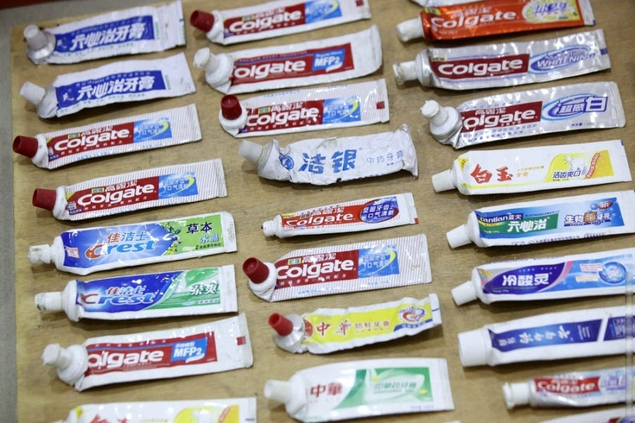 Так как у зубной пасты, как и у любого другого средства гигиены, есть определённый срок годности, Евгению приходится выдавливать пасту и только после этого отправлять пустые тюбики на своё законное место в коллекции.