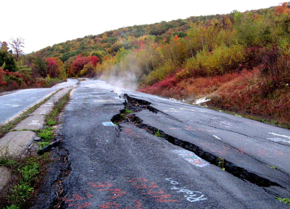 Шахтёрский городок Сентрейлия, штат Пенсильвания, был оставлен жителями по весьма нетривиальной причине. В 1962 году местные власти решили избавится от гор накопившегося мусора на местной свалке и просто подожгли отходы. Но когда куча прогорела, начали тлеть более глубокие залежи отходов, после чего огонь охватил расположенные под городом заброшенные шахты. С тех пор под Сентрейлия бушует огонь, а из трещин в асфальте непрестанно струится дым. Несмотря ни на что жители не хотели покидать свои дома и были принудительно переселены в другое место лишь в 1984 году.