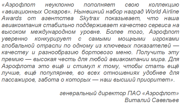 Победа в номинации «Лучшая авиакомпания Восточной Европы» в истории Аэрофлота — шестой раз подряд, в номинации «Лучшее бортовое питание в классе премиум-эконом» — впервые.