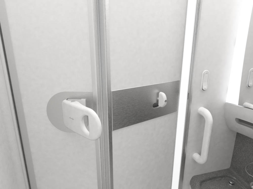 Сообщается, что «скользящим» замком можно управлять при помощи локтя — чтобы открыть или закрыть дверь необходимо переместить засов в сторону и надавить локтём на выступающую ручку. Как рассказали в пресс-службе ANA, при разработке новой конструкции было непросто найти наиболее эффективный дизайн для ограниченного пространства туалетной комнаты. Сначала даже рассматривалась совершенно иная модель замка — на основе управления стопой. Но после многочисленных обсуждений такой вариант был признан слишком опасным, поскольку во время турбулентности пассажиры могут потерять равновесие.