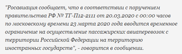 Россия с 23 марта приостанавливает авиасообщение с другими странами. Данное решение принято на основании поручения Правительства РФ № ТГ-П12-2111 от 20.03.2020, сообщает Росавиация сегодня. Такая мера безопасности принята в связи с распространением коронавируса.