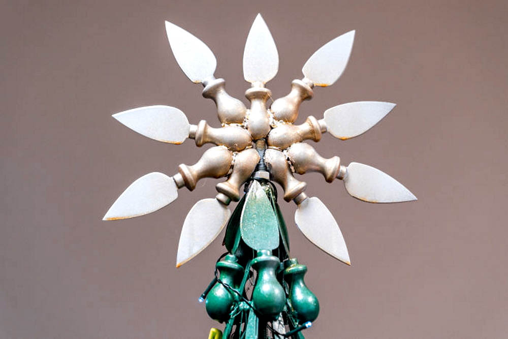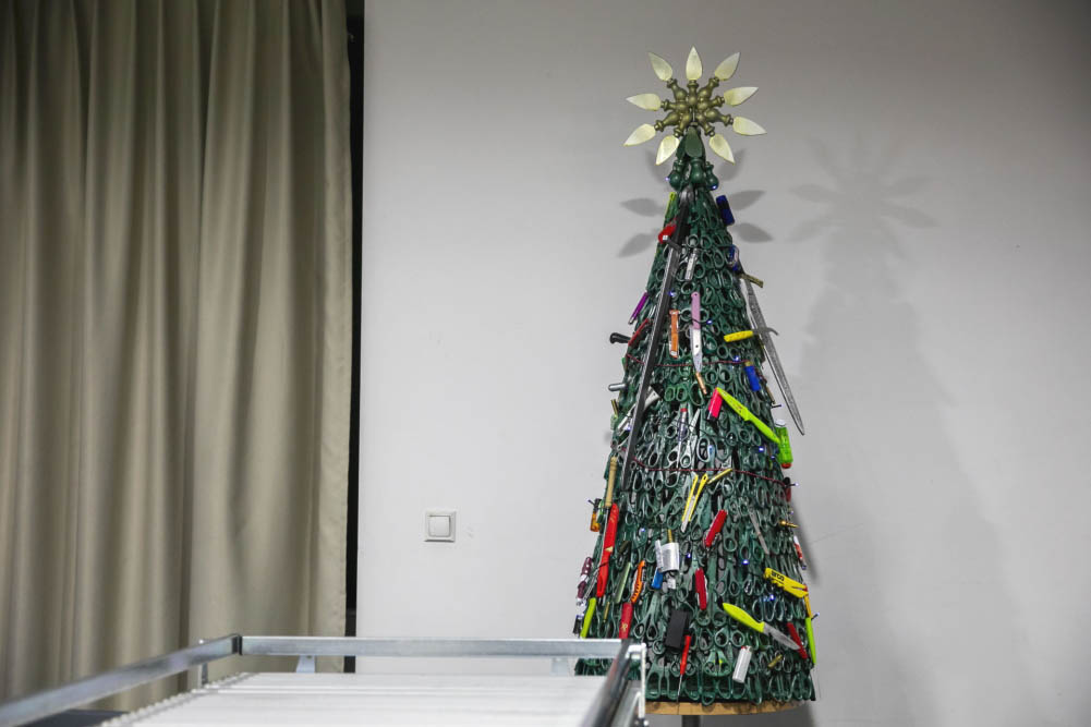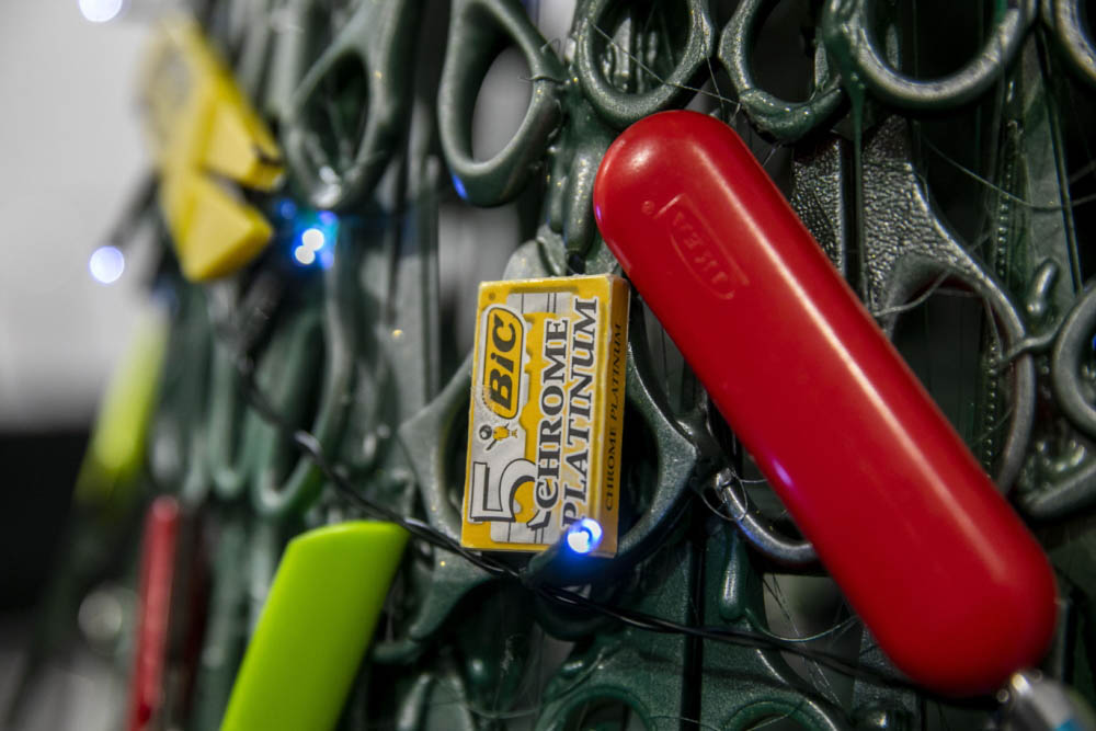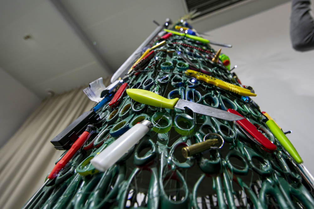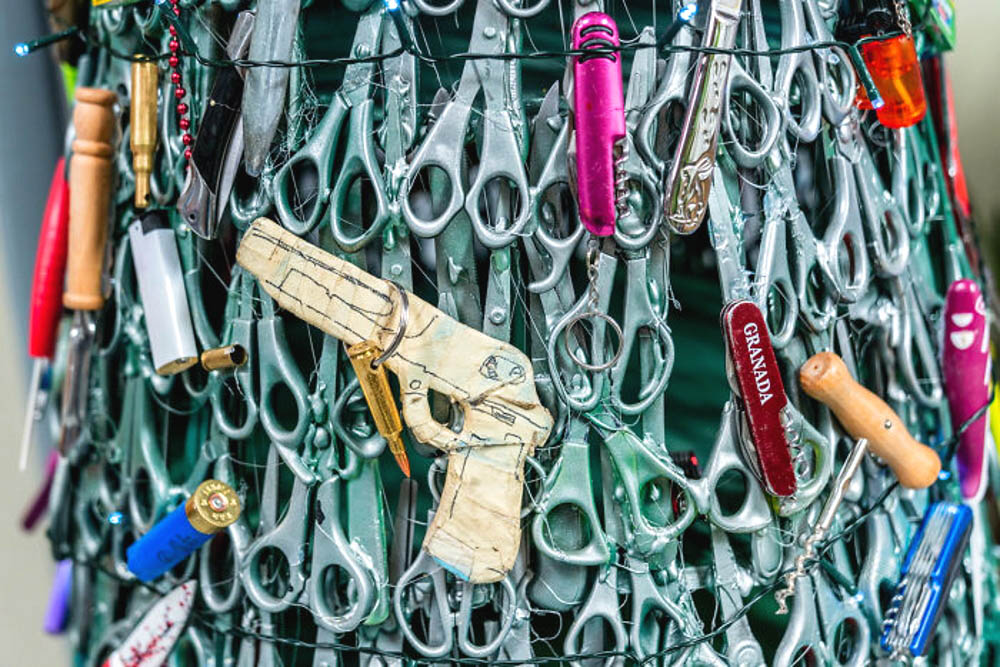 Необычная рождественская ель состоит из предметов, которые запрещено перевозить в ручной клади и которые были изъяты у путешественников во время предполётного досмотра. На новогоднем дереве можно отыскать ножи, ножницы, зажигалки, всевозможные лезвия и многие другие виды опасных грузов.