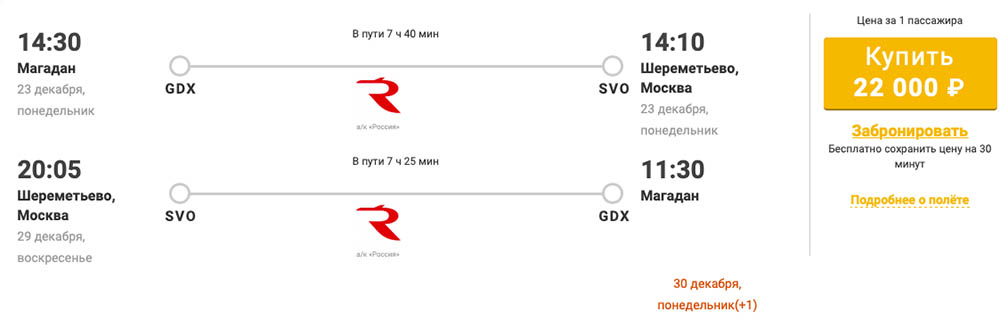 Билеты по «плоским» тарифам от «России» ещё можно приобрести туда-обратно с 23 по 29 декабря за 22 000 рублей: