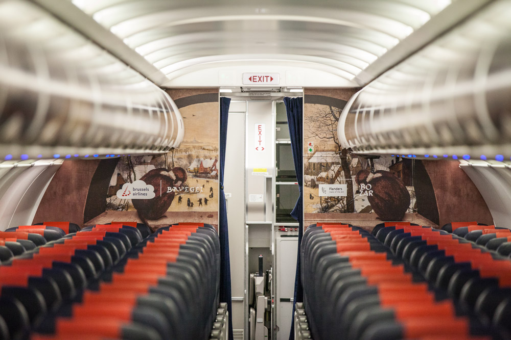 В салоне элементами полотен украсили двери багажных полок и камбузные перегородки. В такой раскраске лайнер Brussels Airlines будет летать до 2024 года. В авиапарке национального перевозчика Бельгии это уже шестой самолёт, украшенный символами страны. Ливреи двух бортов авиакомпании посвящены «Красным дьяволам» — бельгийской сборной по футболу, также перевозчик использует темы со сказочными персонажами смурфами и картинами великого художника Рене Магритта, одна из ливрей оформлена в духе фестиваля электронной музыки Tomorrowland, другая — по мотивам комиксов «Сокровище Красного Ракхама».