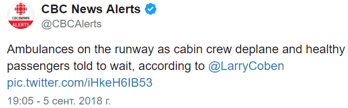 «Все, что нам сказали, — это то, что некоторые пассажиры заболели, а мы должны оставаться на своих местах», — слова одного из пассажиров, Ларри Кобена. Он опубликовал в Twitter машины скорой помощи, которые встречали самолет в аэропорт.