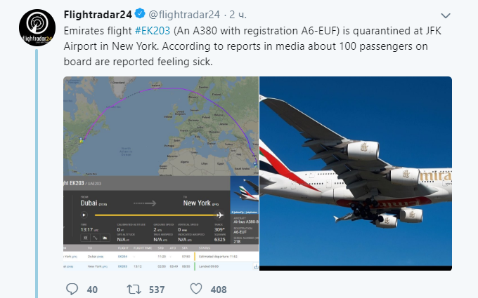 Самолет Airbus А380 авиакомпании Emirates с 500 пассажирами на борту выполнял рейс Дубай — Нью-Йорк. В течение 14 часового перелета около 100 пассажиров пожаловались на плохое самочувствие: кашель и температуру. Пилот сообщил об этом диспетчерам на землю.Лайнер приземлился в аэропорту Джона Кеннеди в Нью-Йорке, где его встретили сотрудники Центра по контролю и профилактике заболеваний, врачи и полицейские.