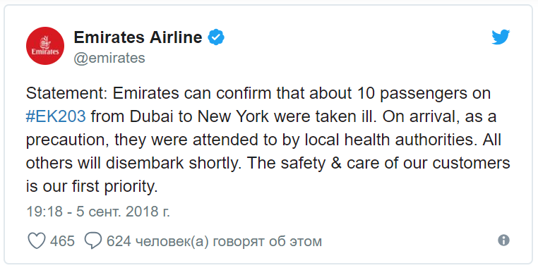 Позже в компании Emirates подтвердили информацию только о десяти заболевших. С их слов, все пассажиры осмотрены, заболевших направили в карантинную зону. Остальных пассажиров выведут из самолета в ближайшее время.