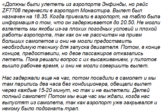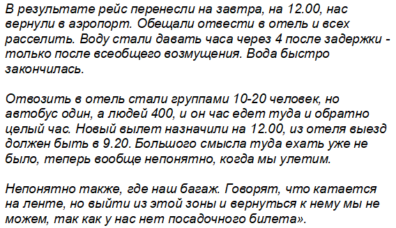 Турист Игорь Чурилов, которому пришлось ночевать в тунисском аэропорту, рассказал, что сначала рейс перенесли из аэропорта Энфида в Монастир, но и оттуда лайнер не смог вылететь. По его словам, препятствием стали плохие погодные условия и особенности аэропорта, не рассчитанного на прием больших самолетов. А после длительного ожидания двое пассажиров отказались лететь. И пока решался вопрос со снятием их с рейса и выгрузкой багажа, у пилотов вышло рабочее время.