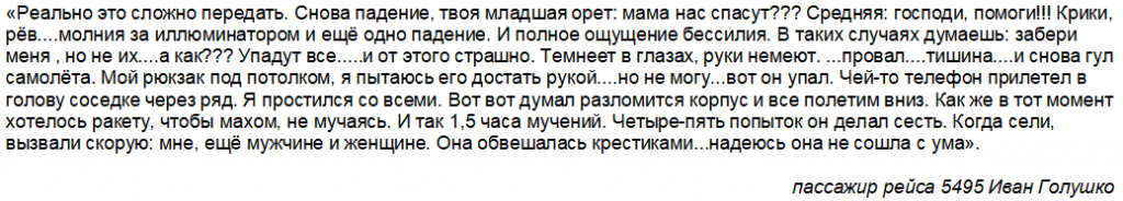 Посадка самолета осуществлялась в сложных метеоусловиях, в очень сильную грозу: сверкали молнии, был сильный грохот и ветер. Пилоты четыре раза «попытали удачу», несмотря на регламент, согласно которому, после второй неудачной попытки нужно было лететь на другой аэродром.На протяжении 1,5 часов пассажиры испытывали настоящих страх и стресс. На борту самолета царил ужас, хаос и паника: плачь, крики, мольбы о помощи. Бортпроводники, как могли, держали ситуацию и успокаивали людей.