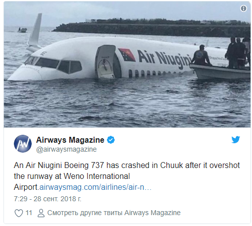 Самолет авиакомпании Новой Гвинеи Air Niugini 28 сентября после аварийной посадки в аэропорту штата Чуук Микронезии ушел под воду. Об этом сообщает Pacific Daily News со ссылкой на руководство аэропорта.