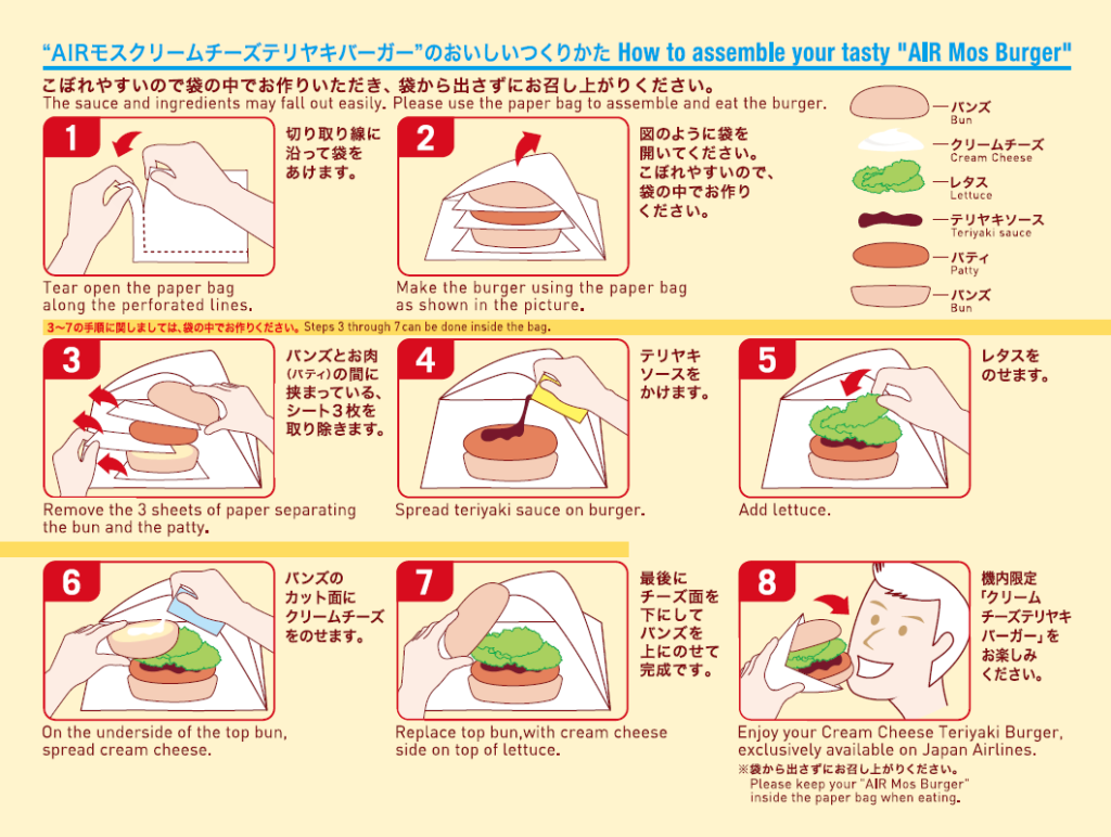 Все ингредиенты для приготовления бургера с соусом терияки продумала японская авиакомпания совместно с сетью ресторанов быстрого питания MOS Food. Весь процесс приготовления описан в отдельной пошаговой инструкции, которая располагается в специальной зоне готовки, а также вместе с бортовыми журналами.Бургер доступен в качестве обычной опции бортового питания, его не нужно заказывать отдельно. Пока эта приятная опция доступна не на всех рейсах. Ощутить ее на собственном опыте можно на следующих маршрутах: