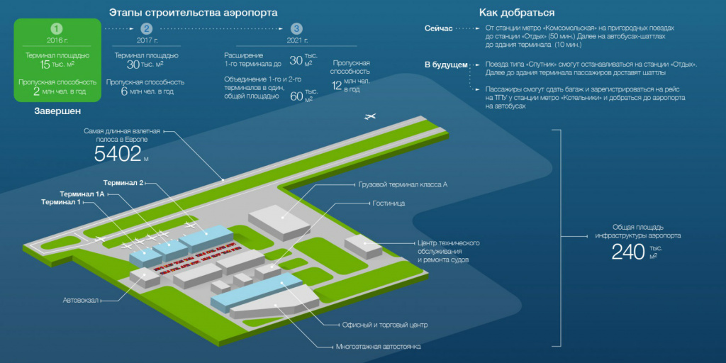 Сегодня, по протяженности взлетно-посадочной полосы, аэропорт занимает второе место в мире, ее длина — 5,4 км, что позволяет принимать все типы воздушных современных судов. Согласно разработанному проекту по развитию, до конца 2019 года планируется закончить строительство двух пассажирских терминала, которые смогут пропускать до 7 млн. пассажиров в год, гостиницу на 250 номеров, офисные здания, автомобильную парковку и стоянку, а также вокзал для аэроэкспрессов.