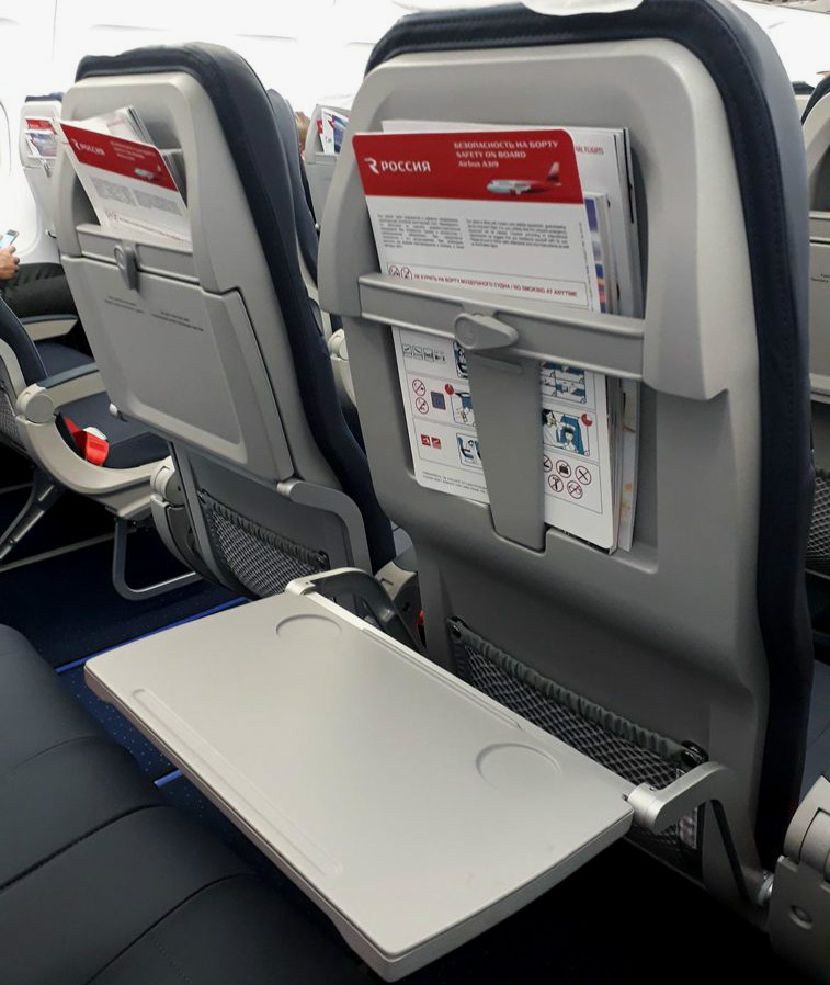 За счет уменьшения толщины кресел, в лайнере добавилось место между рядами, и появилась возможность увеличить угол отклонения спинок. На откидных столиках — специальные углубления для стаканов, в количестве двух. Карман для прессы вынесен вверх, а сетка-кармашек расположена снизу.