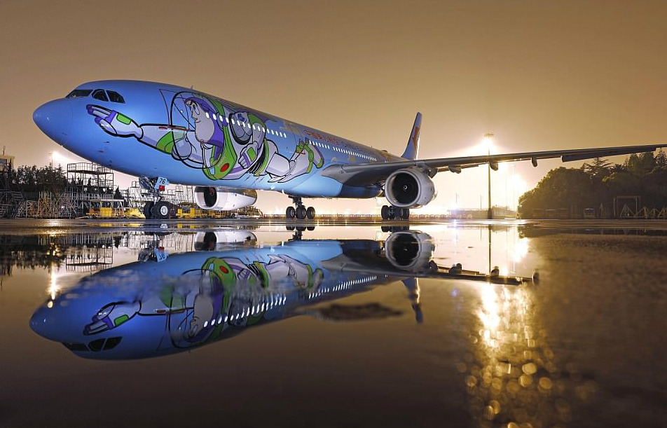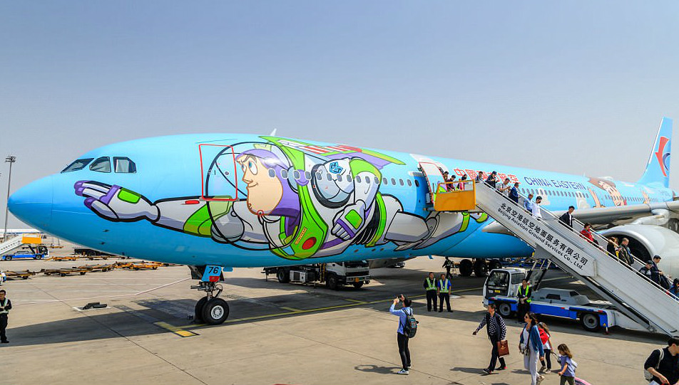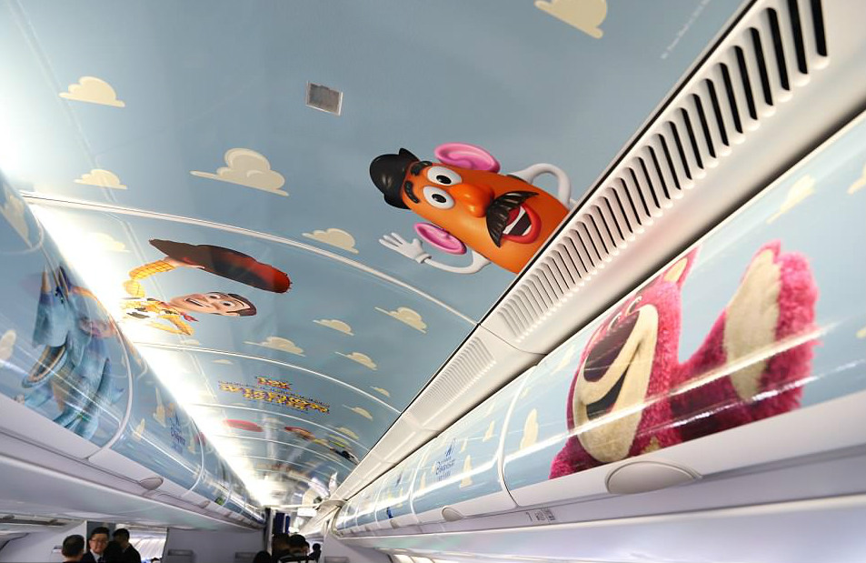 Авиакомпания «China Eastern Airlines» нашла необычный подход к своим внутренним рейсам. Ливрея, интерьер самолета, форма бортпроводниц, посадочные талоны, даже стойки регистрации — все сделано в стиле мультфильма «История игрушек» компании Disney. Появление приурочено к открытию новой тематической зоны Toy Story Land в Диснейленде Шанхая.