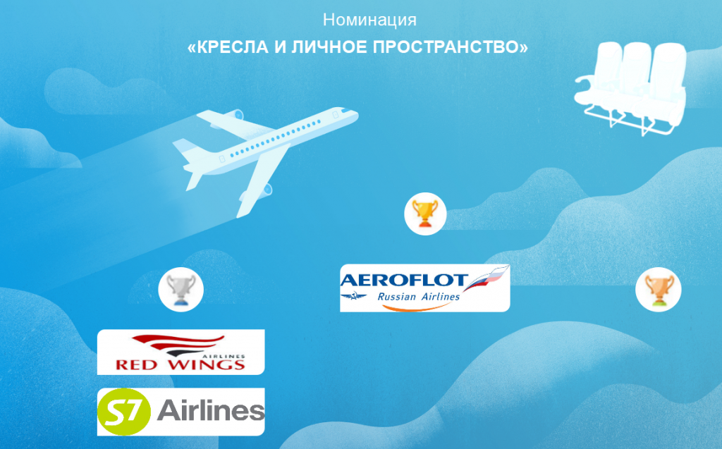 По итогам исследования победителем в номинации «Кресла и личное пространство» стала авиакомпания «Аэрофлот». Во всех ее самолетах (Boeing 777-300, 737-800; Airbus A330 (200, 300), A321, A320; Sukhoi SuperJet 100) достаточное личное пространство для ног, и в большинстве воздушных суднах имеются электрические розетки.
