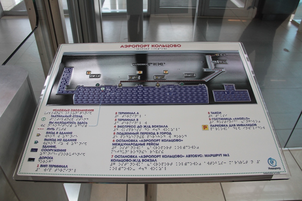 В аэропорту «Кольцово» установили тактильные карты аэровокзального комплекса и прилегающей территории для незрячих пассажиров. Специальные информационные стенды размещены на входах в терминалы А и В, в зонах досмотра, а также на выходах из здания аэровокзала.
