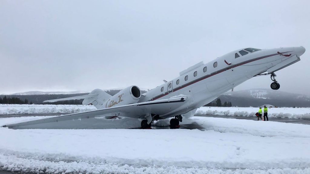 В калифорнийском аэропорту самолёт примёрз в странном положении. Выпавший 16 января снег оказался настолько тяжелым, что передняя часть Cessna Citation X задралась, а задняя — вмерзла в так называемый «Сьерра Цемент», сообщает ABC7 news.