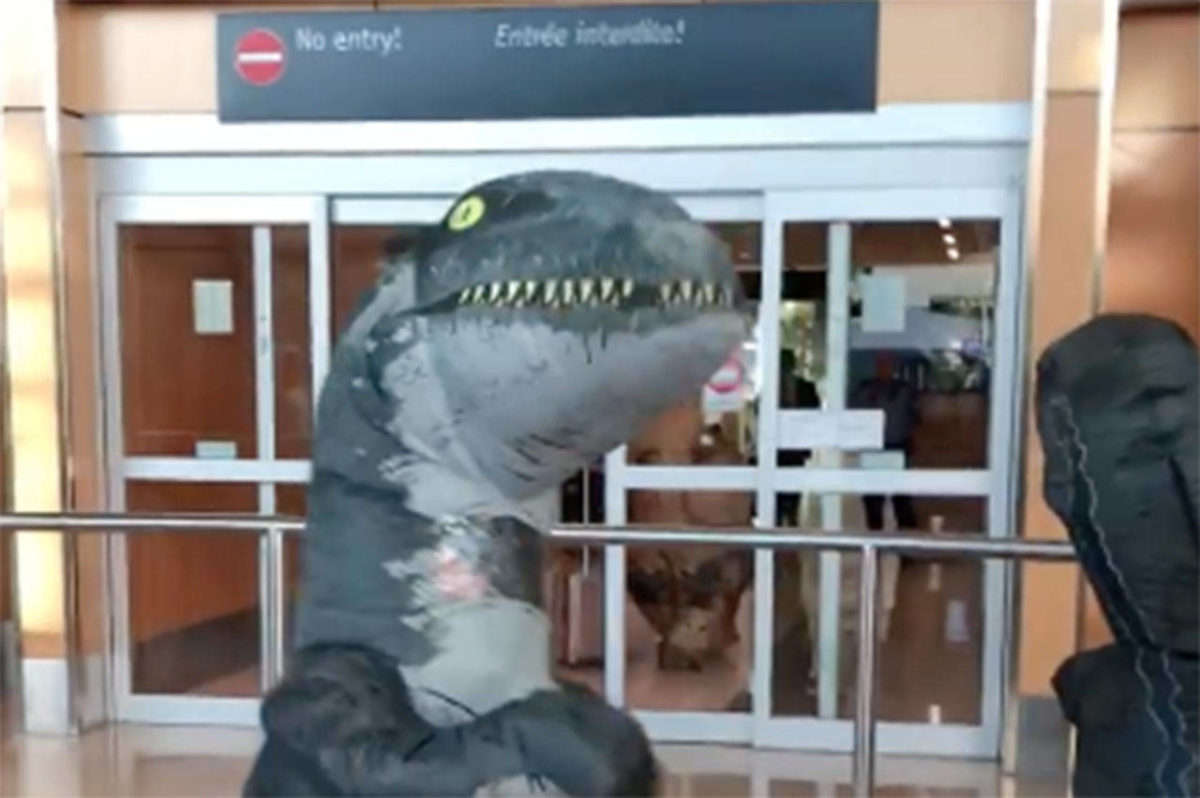 Работники воздушной гавани и туристы смогли на мгновение попасть в «Парк юрского периода». Два молодых человека решили встретить свою бабушку в костюмах динозавров. Сообщается, что два года назад женщина уже подшутила подобным образом над своими внуками. Однако молодые люди и представить не могли, что и бабушка выйдет из зала прилёта наряженная в костюм древней рептилии.