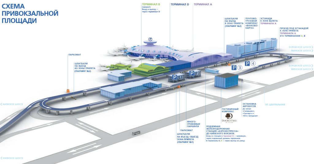 Подъезд на все линии движения к терминалам и на эстакаду (зона вылета терминала А) открыт для всех видов частного транспорта, а также такси. Въезд с Боровского шоссе в сторону аэропорта Внуково также открыт. Автобусная остановка по-прежнему будет находиться на ул. 1-я Рейсовая, откуда можно попасть в терминал А по подземному пешеходному переходу.Кроме того, в аэропорту Внуково изменились тарифы на круглосуточных многоуровневых паркингах № 1 и № 2. Подробнее о новых тарифах здесь.