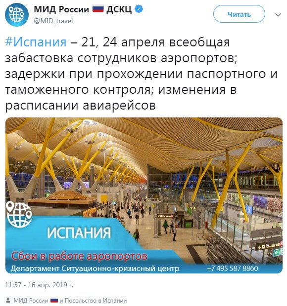 В испанской забастовке будут участвовать 60 тыс. человек, акция протеста направлена против сокращений персонала наземных служб. Авиапассажиры в эти дни могут столкнуться с затруднениями при прохождении паспортного и таможенного контроля, возможны изменения в расписании полётов.