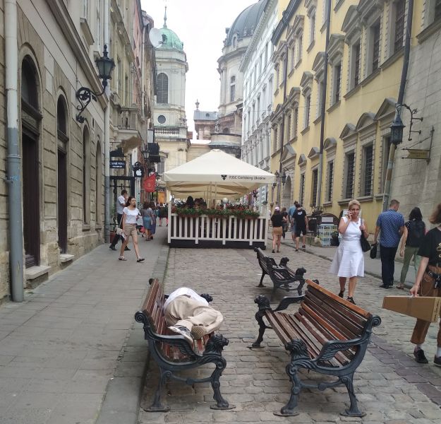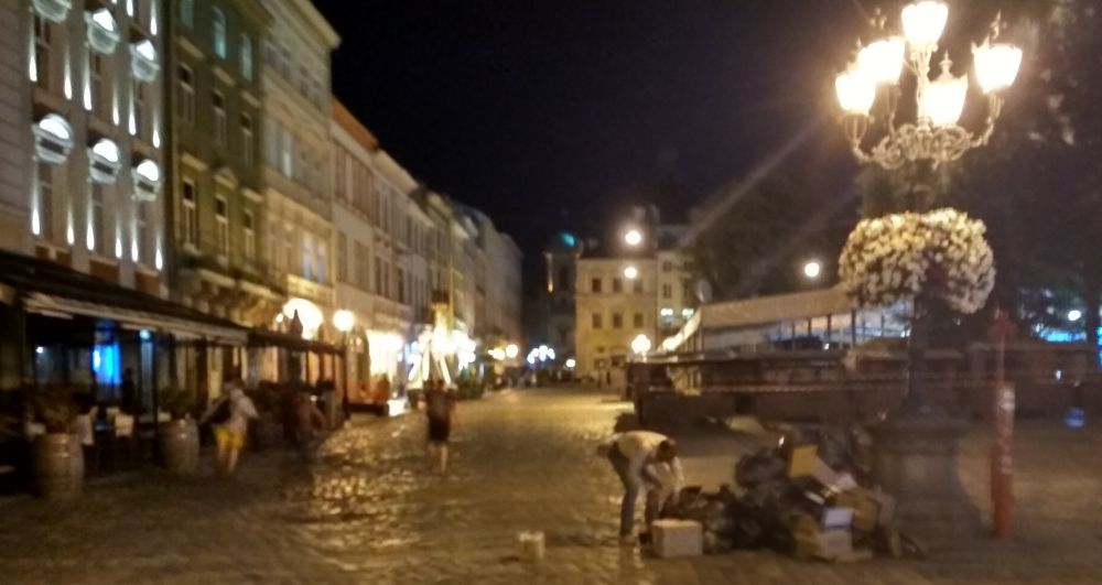 Да, проблема бездомных это крест за прогресс общества. Весь день и немного ночью жизнь в центре кипит так, что порой подкипает. И логично, что после закрытия, когда основная часть людей расходится, заведения прощаются с накопленным за вечер мусором через черные мусорные мешки, которые они выносят к урнам на площади.