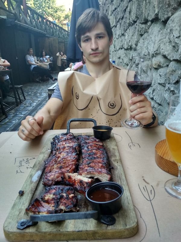 Дешевым удовольствие не назвать. На двоих (на подносе с фото 2 порции) это лучший способ потратить 440 гривен (140х2 ребра + 50 пиво + 80 вино). И да, вино под мясо должно быть красным. Это важно.