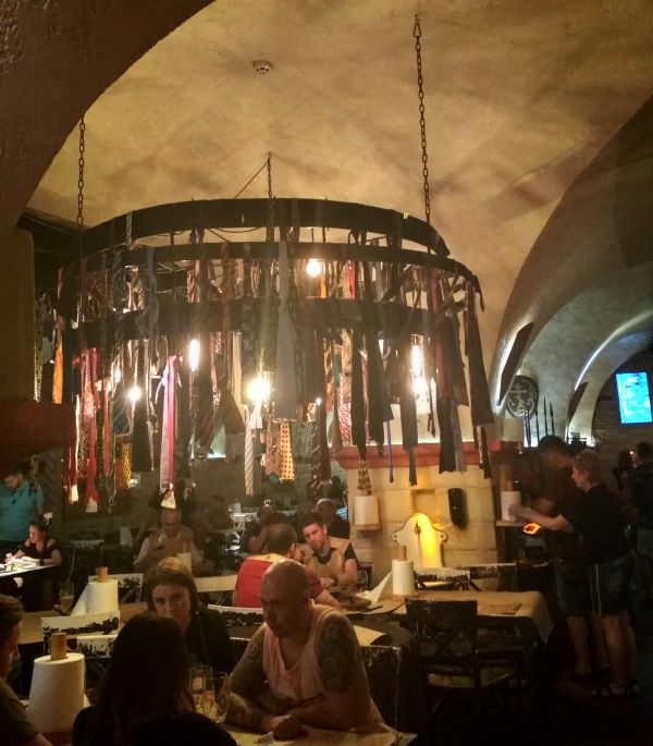 Фирменное блюдо “Реберни” - ребра с соусом - самого отъявленного пацифиста превратят в воина с жаждой одного: мяса. Оформлено заведение уникально: на улице это деревянные столики а-ля таверна. Скатерти и столовые предметы...скажем так, они есть, но такими вы их еще не видели. Официант расстилает на стол бумажные скатерти, маркером (!) рисует вилки, ножи, тарелки и с краю пишет сам заказ. Есть блюда в “реберной” принято руками, потому нарисованные маркером вилки - единственные столовые приборы, которые вы увидите. Готовые обжаренные ребрышки приносят на подносе и в “прямом эфире”, то есть при госте, рубят мясным тесаком, который специально для этого висит у каждого официанта на поясе. Потому, чаевые лучше оставлять.