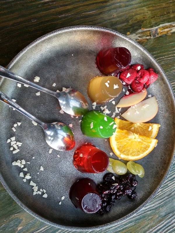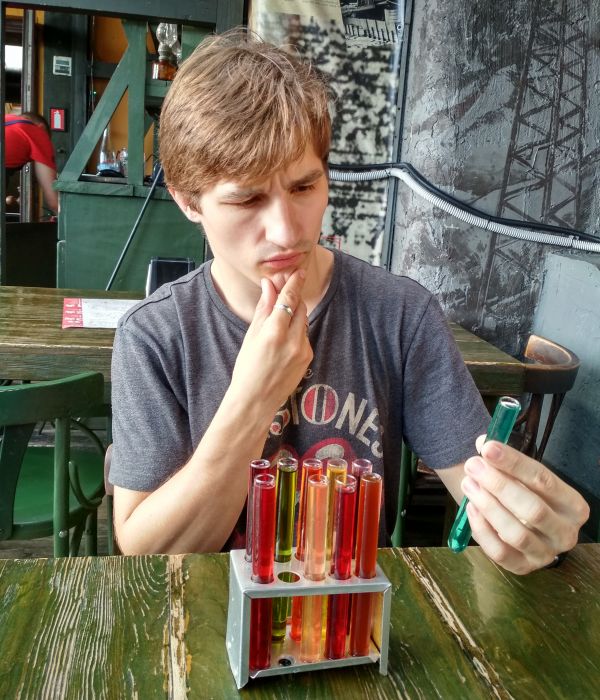 По атмосфере (не в последнюю очередь благодаря мелодичному року) заведение ближе к пабу, кухня преимущественно европейская. Поэтому, ну не смог я удержаться и не заказать оригинальные “кольоровi буцики” и “хiмiчний дослiд”. Это алкогольное желе и набор из пробирок, которые в рамках эксперимента заполнены разными наливками. Опознать их все по вкусу - та еще задача.