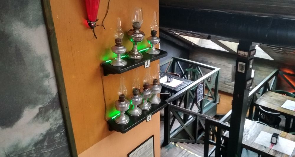 И не напрасно. Поскольку это самый настоящий музей керосиновых ламп всевозможных видов и размеров. Если вы никогда в жизни не видели керосиновую лампу вживую, то “Гасова лямпа” восполнит этот пробел с избытком. Здесь есть и настольные лампы, и подвесные, и железнодорожные, и морские, и студенческие (да, оказывается, есть и такие) и прочие, прочие, прочие. Суммарно на 4 этажа заведения приходится 528 ламп (!). Быть может, это не самое большое хранилище “керосинок” в Европе, но так много ламп, как здесь, видеть мне не доводилось. Отрадно, что специально выискивать каждую лампу, как в какой-нибудь игре на телефоне, не нужно. Информация о всех видах ламп можно увидеть на оборотной стороне меню (которое спокойно можно забрать с собой) в виде карандашного эскиза. Выкладывать фото с самыми интересными я специально не стал - такие вещи лучше увидеть самому.