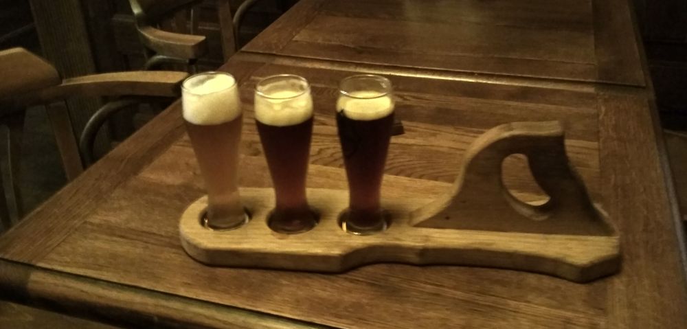 Так вот, для меня “Кумпель” запомнился как паб и про пиво. А поскольку пиво я не люблю, но пробовать хочу, то для таких как я создали универсальный “пробник” на 0,6 литра. Шесть позиций: три эля и три пива. Составленные, как универсальный инструмент 6 в 1, на подставку, по сотне миллилитров каждый. Для удобства все они подписаны, а нарисованные стрелки дают понять что за чем пить.