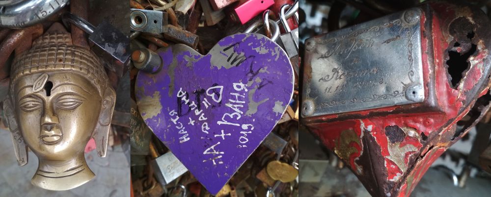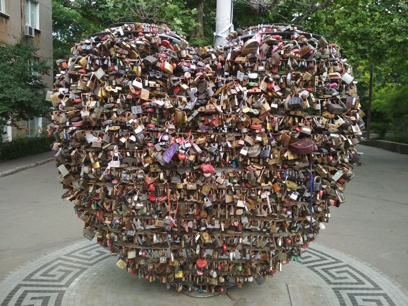 Находящаяся сразу за мостом инсталляция возникла в 2011 году. Своим созданием спасла мост, который от навешанных “замочков любви” готов был сам прогнуться. Сейчас, все желающие могут повесить замок за это сердце. Если, конечно, найдут место. Креативно и красиво, если смотреть издалека.