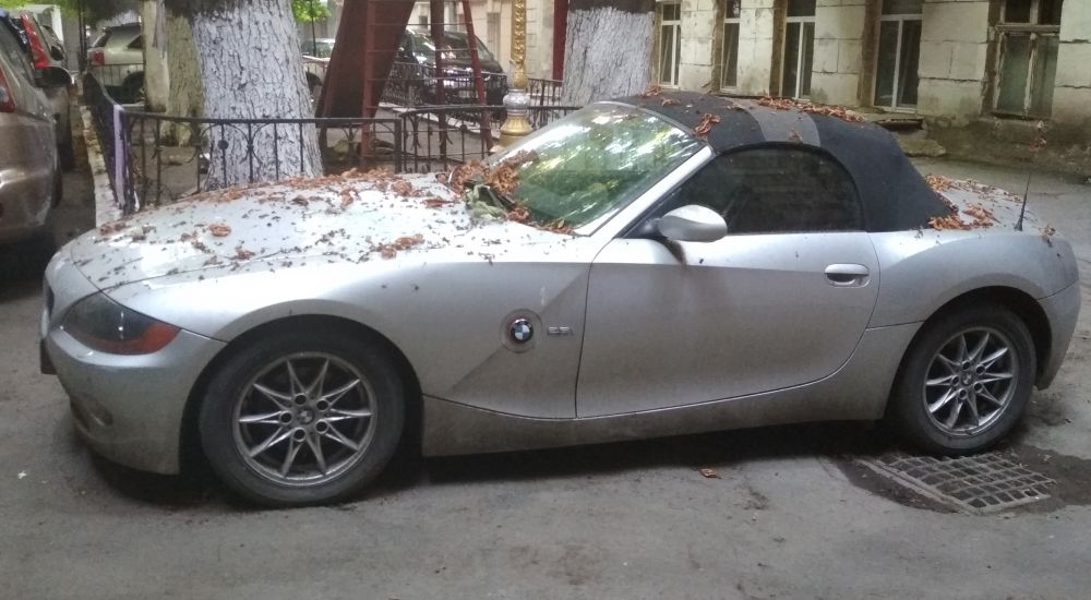 С виду обычная “Бэха” Z4 обрастает аурой загадочности, если провести по ней пальцами. Судя по слою пыли, стоит этот роскошный и узнаваемый кабриолет здесь никак не меньше полугода. В памяти всплывает не менее легендарная “семерка” из “Бумера”. Хочется верить, что здесь не так всё драматично.