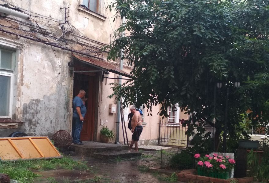 Не хуже “Маски-Шоу” в Одессе умеет шутить и погода. Порой, даже над местными жителями, будто напоминая им, что не они выбирают место для жизни, а жизнь выбирает места для них. Стоило одной одесситке пожаловаться, что тучи вот уже пятый день минуют Одессу, как через полчаса мощный ливень звонко сотрясал крыши близлежащих домов. Меня ливень застал на ул. Гоголя, 9. О ней я писал в материале про дворы. Ближайшая лавочка оказалась с навесом и это хорошая новость. Плохая же заключалась в том, что лавочка под навес не помещалась. Чтобы не промокнуть, пришлось сидеть под ним сложившись, как детская раскладушка.