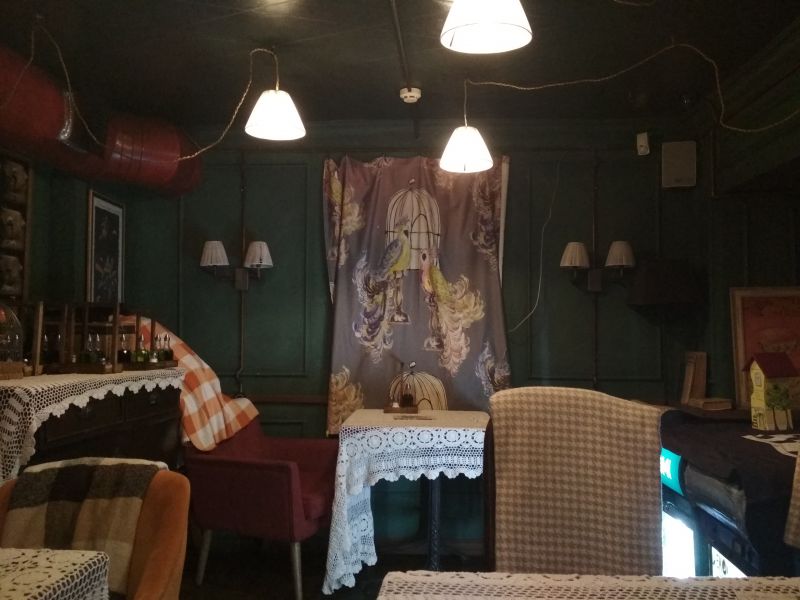 Заведение, созвучное с названием десерта, расположено напротив утратившего вида памятника культуры - дома Гоголя-писателя. О нем я вспомню в другой раз. Сейчас же все внимание "Гоголю-Моголю". В интерьере заведения царит атмосфера бабушкиного гостеприимства: вязаные скатерти, люстры с крытыми абажурами и великое множество тумб, шкафов и кресел советских времен. Пошатывающиеся столики прилагаются)