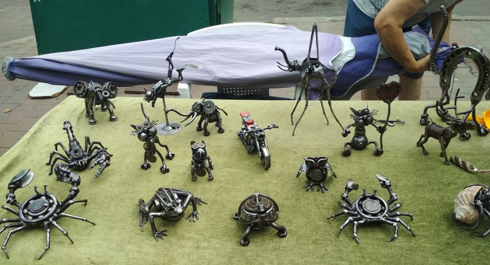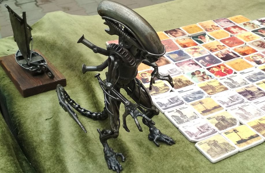 Вот такой ксеноморфик из “Чужого”, сваренный из подшипников, шестерней и правильных рук автора, по словам хозяйки, стоит “пять”. Но не долларов, евро или башмаков, а гривен и тысяч. Конечно, торги никто не отменял. Это же Одесса...