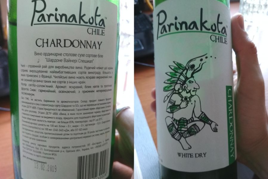 В завершении про истину в вине. Ниже на картинке чилийское вино. Об этом говорит этикетка, надпись Chile и в меру адекватный ценник. Однако, на обратной стороне выясняется, что сорт Шардоне, из которого изготавливают чилийские вина не имеют ничего общего с представленным вином. То есть, не указывается даже то, что это вино могло быть изготовлено из виноградного сусла чилийского винограда. Это обычное вино из Одесской области, где “чилийское” только надпись на красивой этикетке. А по сути наше, одесское.