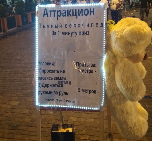 Аттракционы на этой подводной части айсберга соответствующие: повисеть на вращающемся турнике, скушать 5 пачек печенья на время, лопнуть из воздушки 9 из 10 воздушных шариков. И вершина всего, “Пьяный велосипед”.