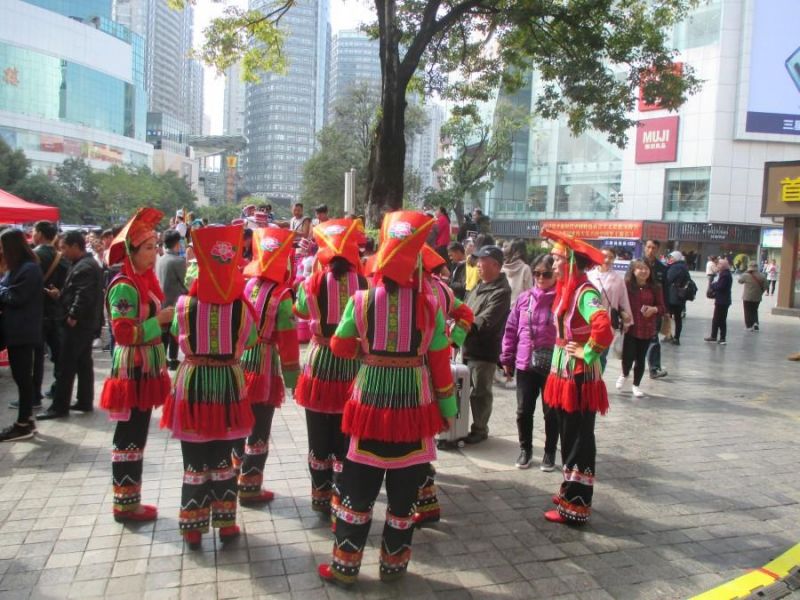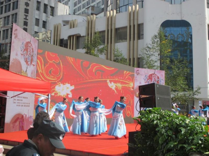 На улице Женъи лу проходил какой-то праздник, и на эстраде плясали девушки в красивых национальных костюмах национальных меньшинств провинции Юньнань:
