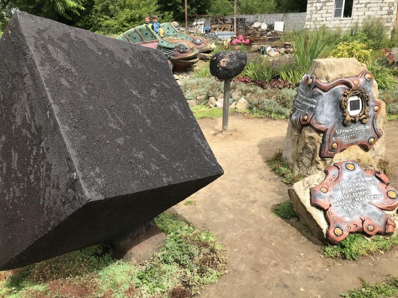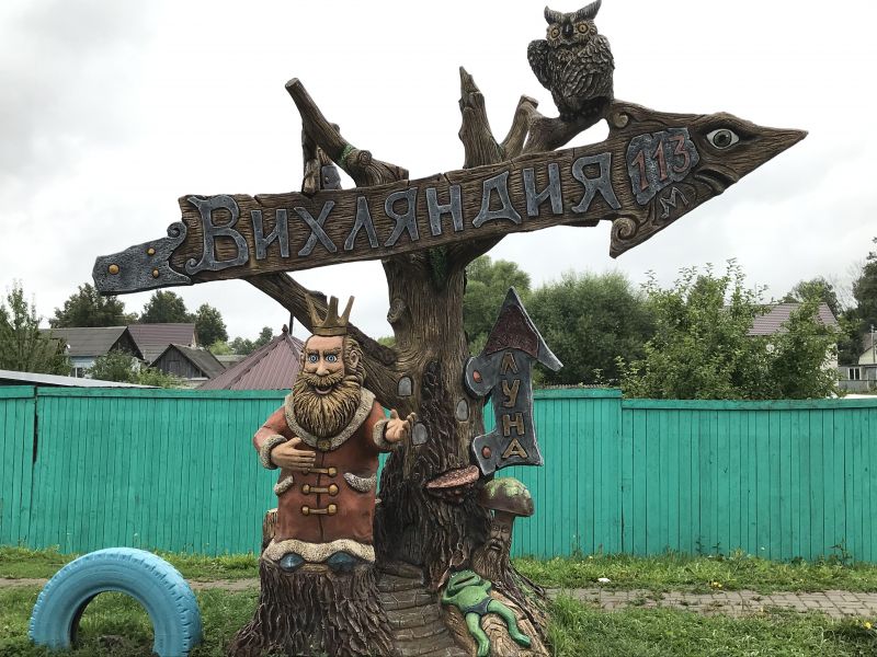Но время до экскурсии было, поэтому уже в дороге открыли интернет (в целом он в Калужской области неплохой) и посмотрели, что в Козельске есть интересного. Увидели какой-то вычурно-красивый дом и непонятно-выкрутасное название: "Вихляндия". Поставили точку на навигаторе и поехали туда. Подъехали к указателю "на", там на его фоне дети фотографируются (дома ещё не видно).