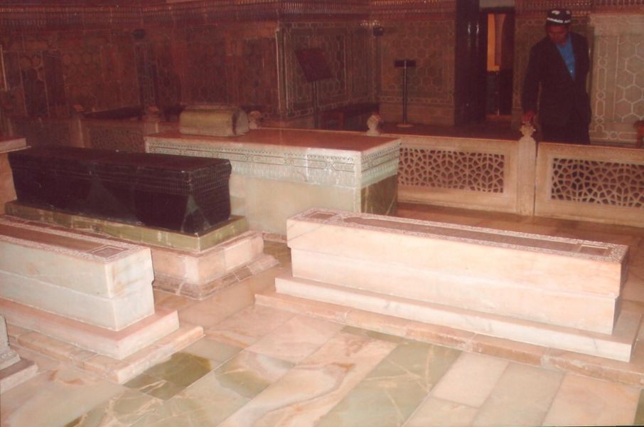 Сначала мы подошли к надгробиям Амира Тимура (черный мрамор) и Улугбека (правее, на одной оси с первым):
