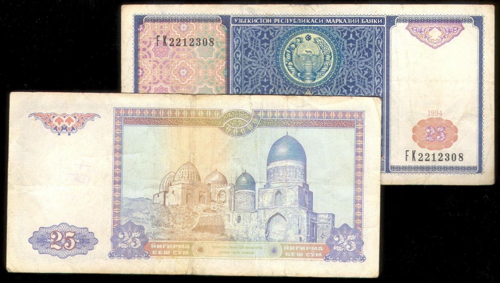 Всю голову уже себе сломал))). Кстати и 100 сумов подобных цветов, но на 25-ти и ближе и сюжет схож. На 25-ти историко-архитектурный ансамбль «Шахи Зинда» в Самарканде, на 100 совсем другая архитектура.