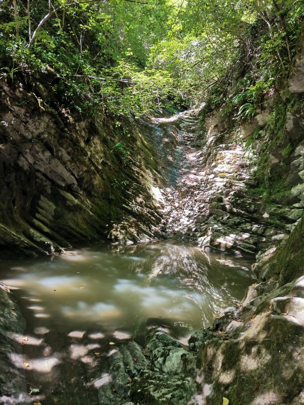 Тропа от кассы идет вдоль ручья в гору. По ней мы и начинаем свой путь. Тут и там слышны голоса других заблудившихся исследователей. Перейдя на другую сторону ручья, вы выходите к Крабовому каньону. К расщелине, где прячутся пресноводные крабы, придется лезть по скале над ручьем! Будьте осторожны!