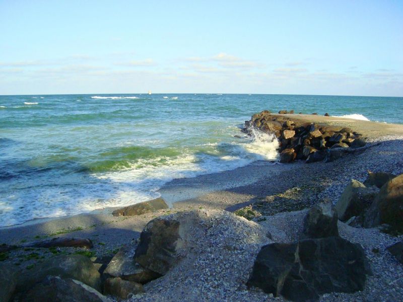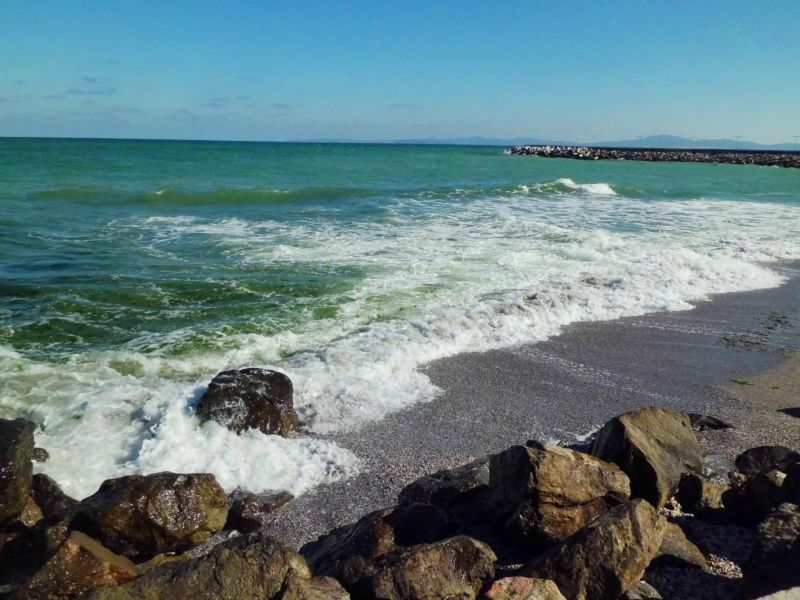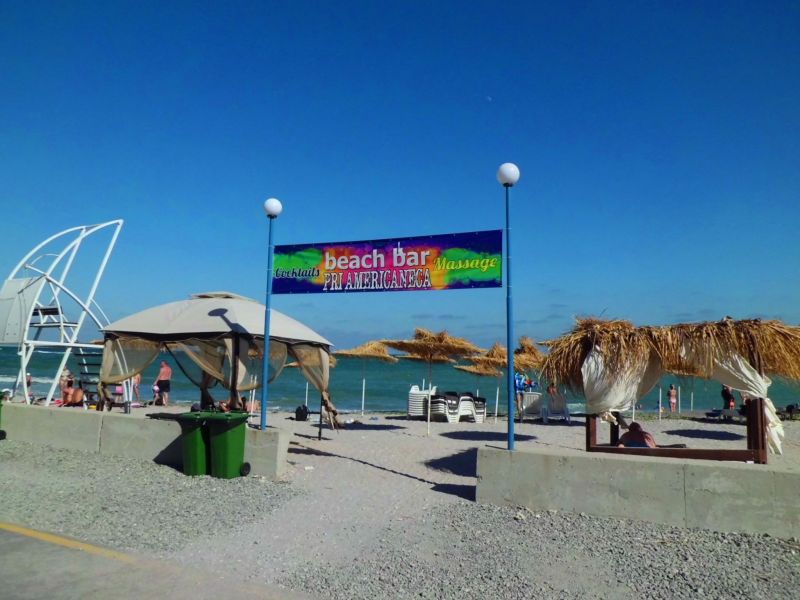И завершающий вариант с песчаным пляжем в самом дальнем «углу» города – пляж у отеля «При американеца». Отель неплохой и стоит у кромки моря. Есть чем заняться и где покушать. Пляж небольшой - порядка двухсот метров в длину и расположен косым треугольником вдоль пешеходной дороги к Восточному пляжу и волнолому. Пляж - смесь песчаника с ракушечником. По контуру берега он окаймлен большими валунами. Платные лежаки и зонты есть в наличии. Вид на морские просторы и маяк, одиноко виднеющийся неподалеку.