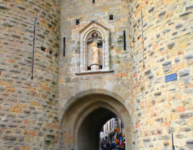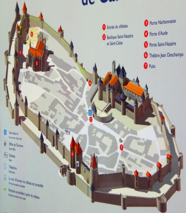 Первый раз будет интереснее пройти через внешнее кольцо стен именно в эти ворота через барбакан и осмотрев, оценить его. Далее, можно либо обогнув внутренние стены цитадели пройти внутрь и внимательно осмотрев второй пояс стен и башен войти в город через другие ворота, либо тут же, под взглядом Дамы Каркас (руководившей обороной во время одной из осад после смерти мужа), миновав башни прямиком оказаться на улочках города. Сам город (Ситэ, как его называют французы) ориентирован по оси направления север-юг на скалистой возвышенности вдоль правого берега реки Од.