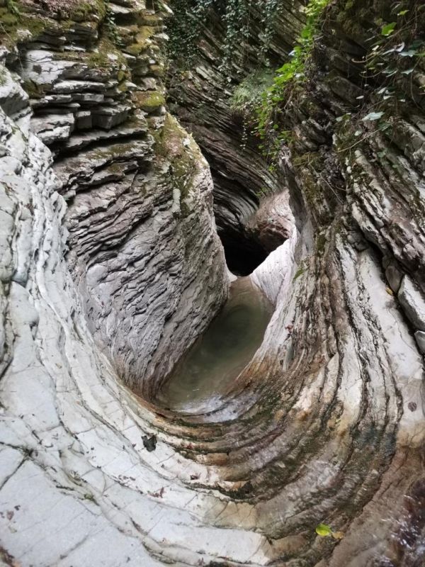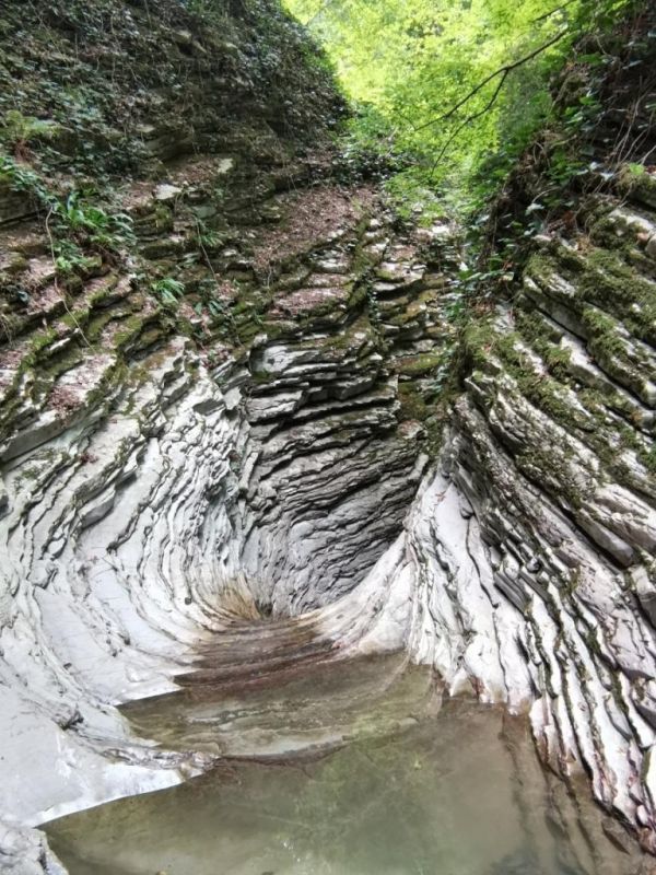 Закончив осмотр правой части, переходим в левую часть. Здесь русло имеет более выраженное течение и слоистую структуру спускающихся вниз скал. По сути, мы видим каменную трубу, в которую затекает поток. Спускаемся ниже, осторожно перебирая всеми четырьмя конечностями, чтобы не «потерять» пятую. Я про голову говорю :-) Вы о чем подумали? :-)