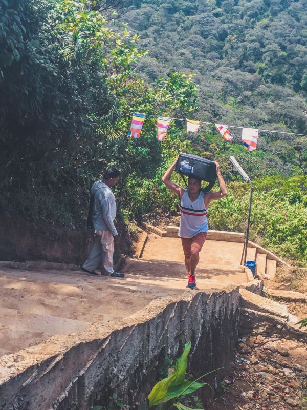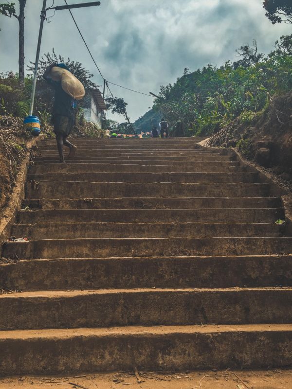 На протяжении всего пути встречаются магазинчики с едой и водой - чем выше, тем все стоит дороже. А еще по пути очень много ланкийцев, доставляющих продукты в те самые магазины: они ходят с тяжеленными мешками вверх и вниз по лестнице несколько раз в день! Вот это настоящий адский труд! Кстати, поднимаются они зигзагами (то есть по диагонали то вправо, то влево) - видимо, так хоть немного снижается нагрузка на ноги.