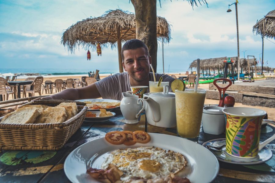 Место, где мы остановились для завтрака, находилось прямо на пляже. Это так кайфово: сидеть, погрузив ноги в горячий песок, наслаждаться вкусным завтраком, запивая его свежим прохладным кокосом, и вглядываться в голубую даль океана.