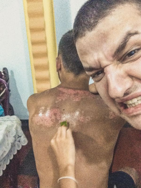 Лежаки в виде кровати - просто суперудобные! Можно лежать рядом вдвоем, спокойно расположить все свои вещи, рядом поставить прохладительные напитки, и что самое главное в первые дни - спастись от сгорания под палящим солнцем! Даже если по небу ходят тучки, солнце все равно не щадит туристов. Поэтому солнцезащитный крем с очень высоким фактором защиты обязателен в любую погоду приезжим с любой, даже хорошо загорающей, кожей! Вот что приключилось с нашим другом:
