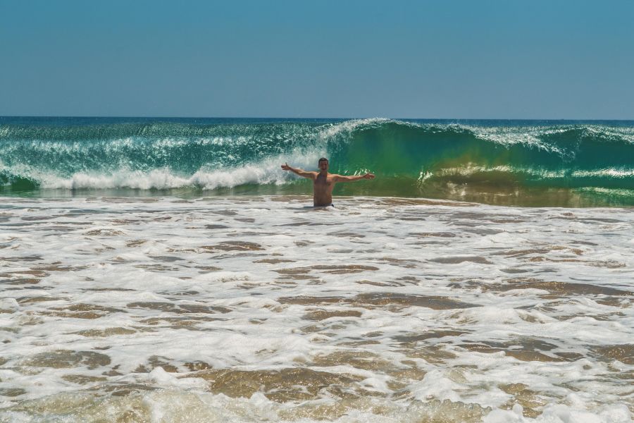 Мы пошли вдоль берега к месту, где наши друзья обычно завтракали. Пока шли, заметили, что волны достаточно большие, и купающихся не так уж много. Зато очень-очень много серферов!