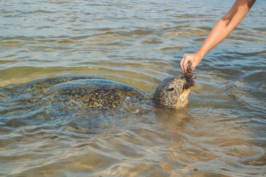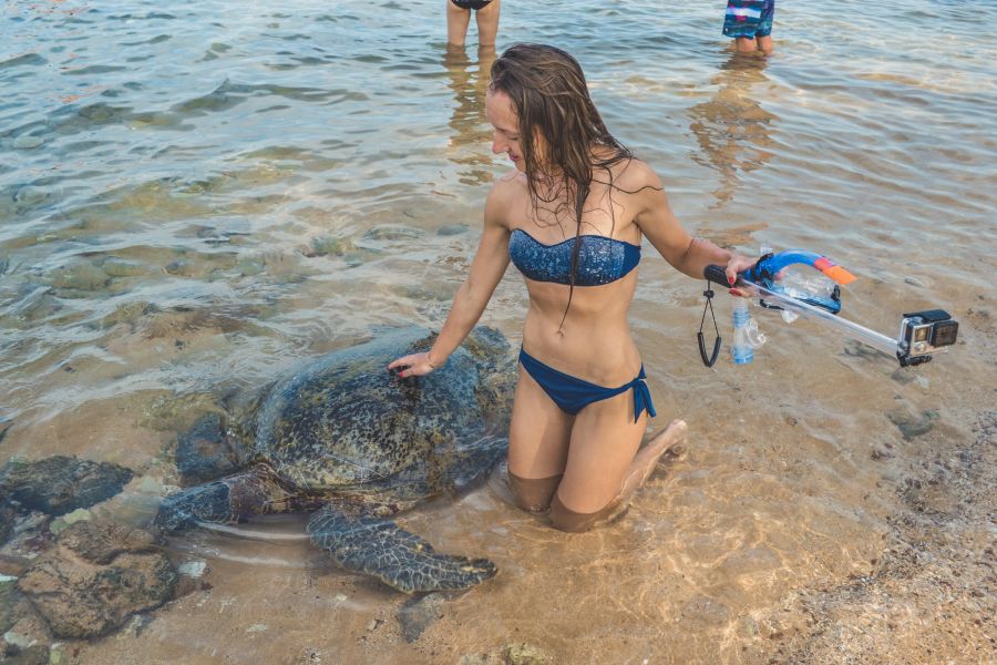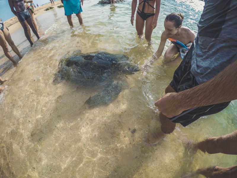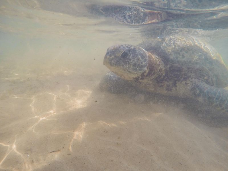 По дороге мы набрали водорослей из океана и вот мы уже ныряем в масках в предвкушении увидеть эти милые создания! Пришлось немного подождать, поплавать туда-сюда, и спустя минут 5-7 приплыли сразу 3 черепахи, достаточно большие!